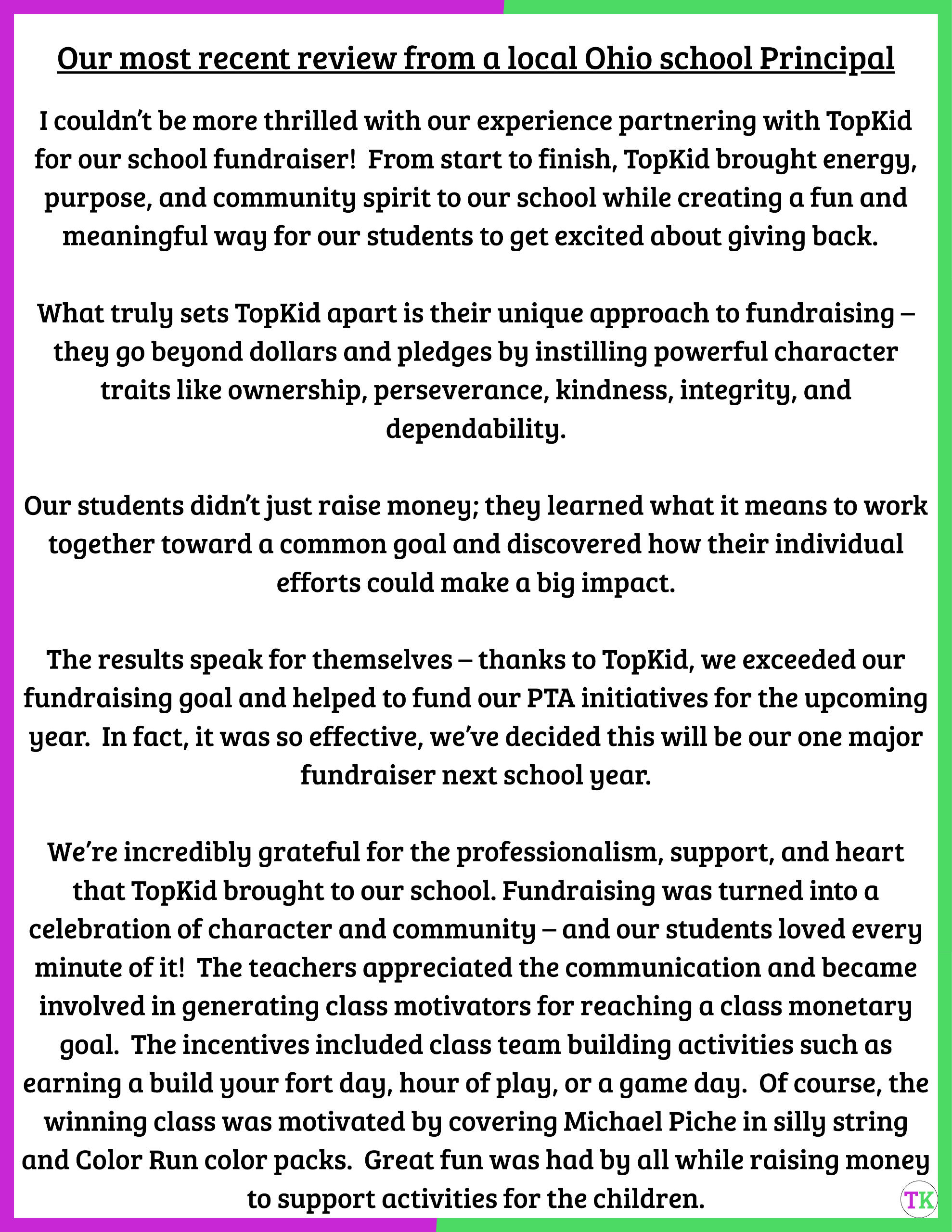 First that your students, families, and school have the best experience possible throughout the TopKid Fundraising Program.